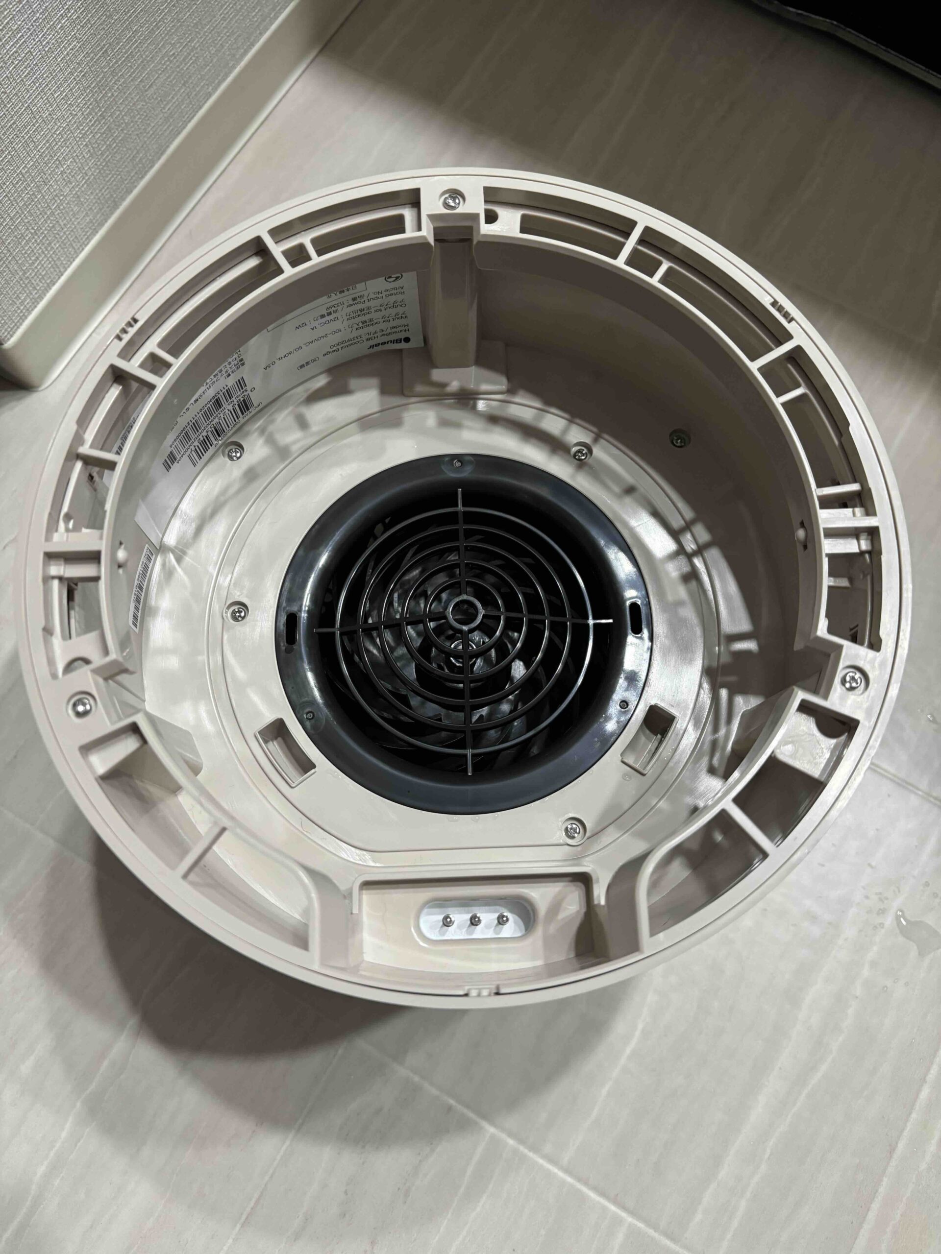 上部分。中央がファン。フィルターから気化する時の湿度を含んだ空気をファンで外に出す。これは気化式の加湿機だとどれも同じだろうけど、シンプルな分、壊れにくいのだろうし、上に素直に排気するだけだから効率も良い。ちなみに、アロマを入れることができるのだが、拙宅には猫がいるので使わない。アロマの使用感は他の方のブログを参照ください。(って、ブログがあるのだろうか)